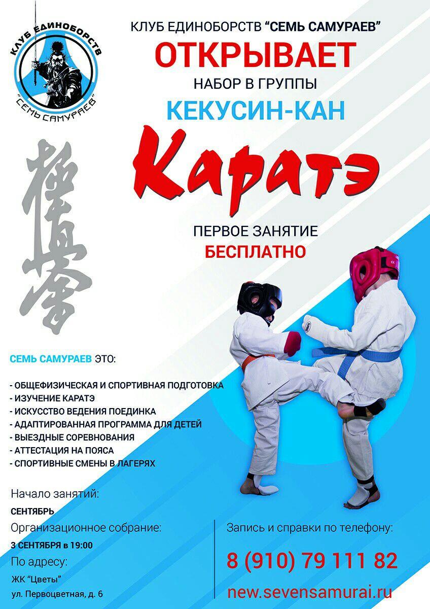 С сентября открывается ещё один тренировочный зал для занятий детей и взрослых по адресу: Приокский район, ЖК "Цветы", ул. Первоцветная д.6. На занятия Каратэ КекусинКан приглашаются все желающие от 4,5 лет и до... В программе освоение кихон (базовой техники), ката (формальных комплексов), кумитэ (спарринговов техники свободного боя), а также владение традиционным оружием (бо, дзё, саи, тонфа). Запись и справки по телефону Клуба!